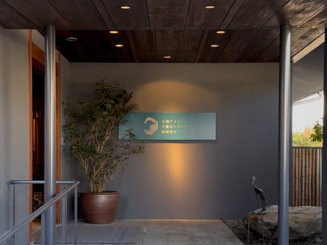周囲の空気感に溶け込みながらも、高い木々と暖簾、高級割烹のような品格、ここだけ別世界の密度をまとっている。目立ちすぎない知る人ぞ知る感がたまらない。駐車場には、高級車がちらほら。その景色を見ただけで、この宿がただの和風旅館ではないことがひしひし伝わってくる。