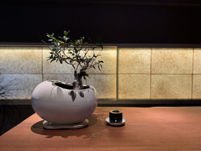 中に入ると、そこには非常に質の高い“和”が広がっていた。盆栽、土の壁、椅子から中庭を望む大窓、置かれている調度品に至るまで。いわゆる流行の和モダンという言葉で簡単に括れない、上質な和を具現化したような空間だ。