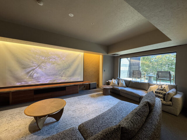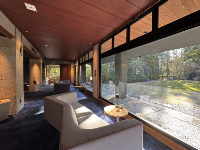 そしてスクリーンに向かって右手側には、スクリーンにも勝るとも劣らない大きな窓がある。外の景色は、春には梅、冬には雪景色も見えるという抜けの良い大窓だ。枠付きの大窓によって、外の風景そのものをインテリアとして部屋の中に引き込んでいる。風景を絵画に昇華するようなデザインにうっとりしていると、隣からまた「すげー…」。ボキャブラリーが戻ってこない圧巻の内観に、もはや笑いすら出てきた。