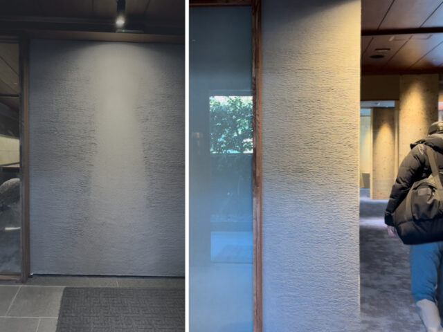 暖簾の上で、佐賀県の形をベースに形成された「枯淡嬉野」のロゴが揺らぐ。暖簾をくぐってエントランスまで向かうと、行き止まり。入り口というより「壁」という方がしっくりくる入口らしい場所に立つと、大壁が自動で開いた。これはいい。本棚がドアになっているような、おしゃれなレストランを思い出す。