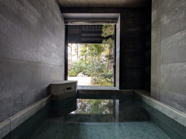 どちらの浴室も露天風呂の雰囲気がいい。内湯を浸かっていく動線や、階段から露天風呂に浸かっていく造りなども、温泉がまさに溢れ出しているような贅沢な感覚になれる。